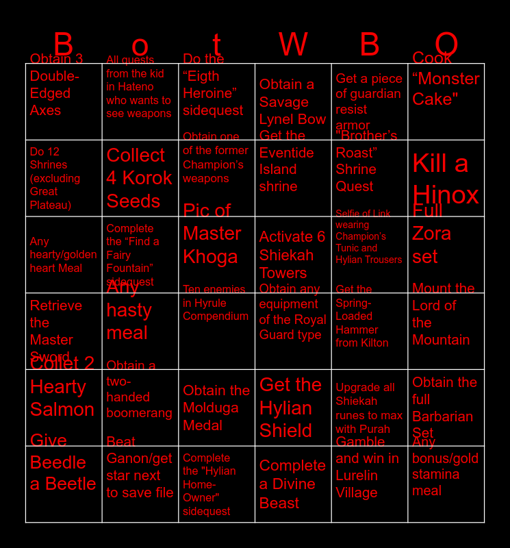 This bingo card has 36 words: Get the Hylian Shield, Obtain the Molduga Medal, Complete a Divine Beast, Do 12 Shrines (excluding Great Plateau), Retrieve the Master Sword, Activate 6 Shiekah Towers, Collect 4 Korok Seeds, Complete the "Hylian Home-Owner" sidequest, Get a piece of guardian resist armor, Upgrade all Shiekah runes to max with Purah, Kill a Hinox, Obtain a Savage Lynel Bow, Obtain the full Barbarian Set, Complete the “Find a Fairy Fountain” sidequest, Get the Eventide Island shrine, Obtain 3 Double-Edged Axes, Collet 2 Hearty Salmon, Selfie of Link wearing Champion’s Tunic and Hylian Trousers, Any hearty/golden heart Meal, Do the “Eigth Heroine” sidequest, Pic of Master Khoga, Any hasty meal, Obtain any equipment of the Royal Guard type, Ten enemies in Hyrule Compendium, Get the Spring-Loaded Hammer from Kilton, All quests from the kid in Hateno who wants to see weapons, "Brother’s Roast” Shrine Quest, Beat Ganon/get star next to save file, Obtain one of the former Champion’s weapons, Cook “Monster Cake", Any bonus/gold stamina meal, Give Beedle a Beetle, Mount the Lord of the Mountain, Full Zora set, Obtain a two-handed boomerang and Gamble and win in Lurelin Village.