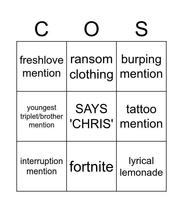 This bingo card has a free space and 11 words: pepsi mention, fortnite, lyrical lemonade, interruption mention, ransom clothing, burping mention, tattoo mention, lil skies mention, youngest triplet/brother mention, freshlove mention and sleeping habits.