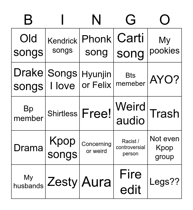 This bingo card has a free space and 24 words: Kpop songs, Zesty, Hyunjin or Felix, My husbands, My pookies, Old songs, Drake songs, Kendrick songs, Weird audio, Concerning or weird, Bts memeber, Bp member, Racist / controversial person, Not even Kpop group, Songs I love, Fire edit, Trash, Phonk song, AYO?, Shirtless, Legs??, Drama, Carti song and Aura.