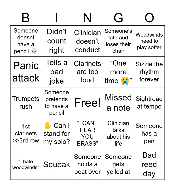 This bingo card has a free space and 24 words: ✋ Can I stand for my solo?, Squeak, Clarinets are too loud, “I hate woodwinds”, Woodwinds need to play softer, Someone doesnt have a pencil 💀, Panic attack, Didn’t count right, Missed a note, “I CANT HEAR YOU BRASS”, “One more time 😭”, Trumpets rush, Clinician talks about his life, Someone has a pen, Tells a bad joke, Someone gets yelled at, Sightread at tempo, Clinician doesn’t conduct, Sizzle the rhythm forever, Someone pretends to have a pencil, Bad reed day, 1st clarinets >>3rd row, Someone’s late and loses their chair and Someone holds a beat over.