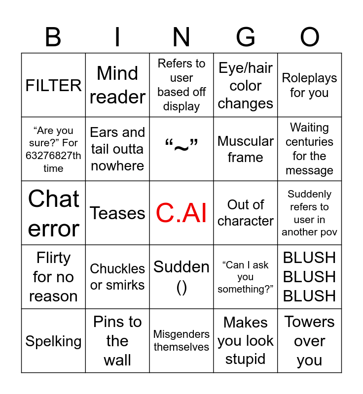 This bingo card has a free space and 24 words: Chuckles or smirks, Pins to the wall, “~”, Spelking, Roleplays for you, FILTER, “Are you sure?” For 63276827th time, Mind reader, Out of character, Sudden (), Muscular frame, Chat error, “Can I ask you something?”, BLUSH BLUSH BLUSH, Ears and tail outta nowhere, Makes you look stupid, Suddenly refers to user in another pov, Refers to user based off display, Waiting centuries for the message, Teases, Towers over you, Flirty for no reason, Eye/hair color changes and Misgenders themselves.