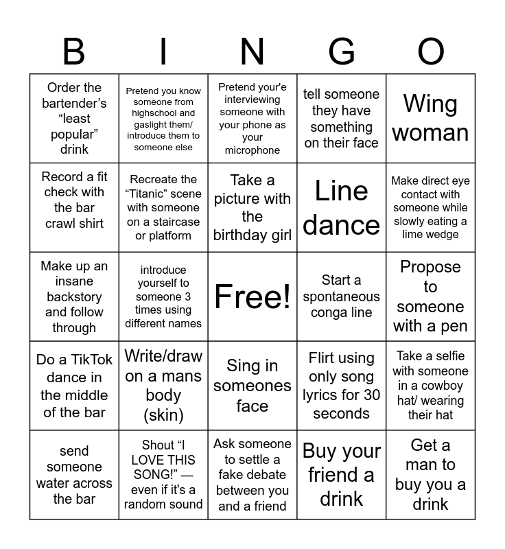 This bingo card has a free space and 24 words: Write/draw on a mans body (skin), Shout “I LOVE THIS SONG!” — even if it's a random sound, Take a picture with the birthday girl, send someone water across the bar, Wing woman, Order the bartender’s “least popular” drink, Record a fit check with the bar crawl shirt, Pretend you know someone from highschool and gaslight them/ introduce them to someone else, Start a spontaneous conga line, Sing in someones face, Line dance, Make up an insane backstory and follow through, Flirt using only song lyrics for 30 seconds, Take a selfie with someone in a cowboy hat/ wearing their hat, Recreate the “Titanic” scene with someone on a staircase or platform, Buy your friend a drink, Propose to someone with a pen, Pretend your'e interviewing someone with your phone as your microphone, Make direct eye contact with someone while slowly eating a lime wedge, introduce yourself to someone 3 times using different names, Get a man to buy you a drink, Do a TikTok dance in the middle of the bar, tell someone they have something on their face and Ask someone to settle a fake debate between you and a friend.