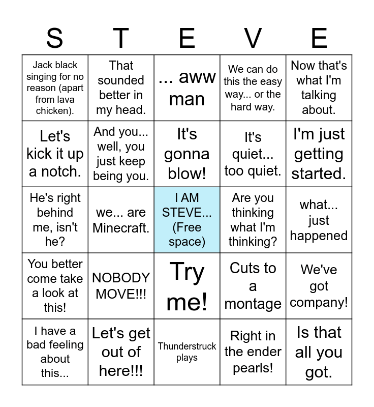 This bingo card has a free space and 24 words: NOBODY MOVE!!!, Let's get out of here!!!, It's gonna blow!, I have a bad feeling about this..., Now that's what I'm talking about., Jack black singing for no reason (apart from lava chicken)., Let's kick it up a notch., That sounded better in my head., Are you thinking what I'm thinking?, Try me!, It's quiet... too quiet., He's right behind me, isn't he?, Cuts to a montage, We've got company!, And you... well, you just keep being you., Right in the ender pearls!, what... just happened, ... aww man, I'm just getting started., we... are Minecraft., Is that all you got., You better come take a look at this!, We can do this the easy way... or the hard way. and Thunderstruck plays.