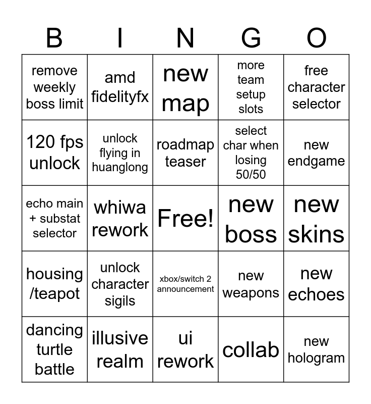 This bingo card has a free space and 24 words: unlock character sigils, illusive realm, roadmap teaser, dancing turtle battle, free character selector, remove weekly boss limit, 120 fps unlock, amd fidelityfx, new boss, xbox/switch 2 announcement, select char when losing 50/50, echo main + substat selector, new weapons, new echoes, unlock flying in huanglong, collab, new skins, new map, new endgame, whiwa rework, new hologram, housing /teapot, more team setup slots and ui rework.