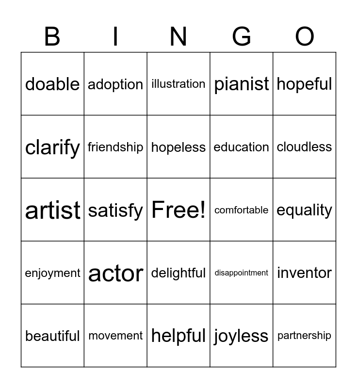 This bingo card has a free space and 24 words: actor, movement, hopeless, beautiful, hopeful, doable, clarify, adoption, comfortable, delightful, education, artist, disappointment, inventor, friendship, joyless, equality, illustration, cloudless, satisfy, partnership, enjoyment, pianist and helpful.