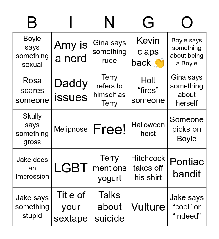 This bingo card has a free space and 24 words: LGBT, Title of your sextape, Terry refers to himself as Terry, Jake says something stupid, Boyle says something about being a Boyle, Boyle says something sexual, Rosa scares someone, Amy is a nerd, Halloween heist, Terry mentions yogurt, Holt “fires” someone, Skully says something gross, Hitchcock takes off his shirt, Pontiac bandit, Daddy issues, Vulture, Someone picks on Boyle, Gina says something rude, Gina says something about herself, Melipnose, Jake says “cool” or “indeed”, Jake does an Impression, Kevin claps back 👏 and Talks about suicide.