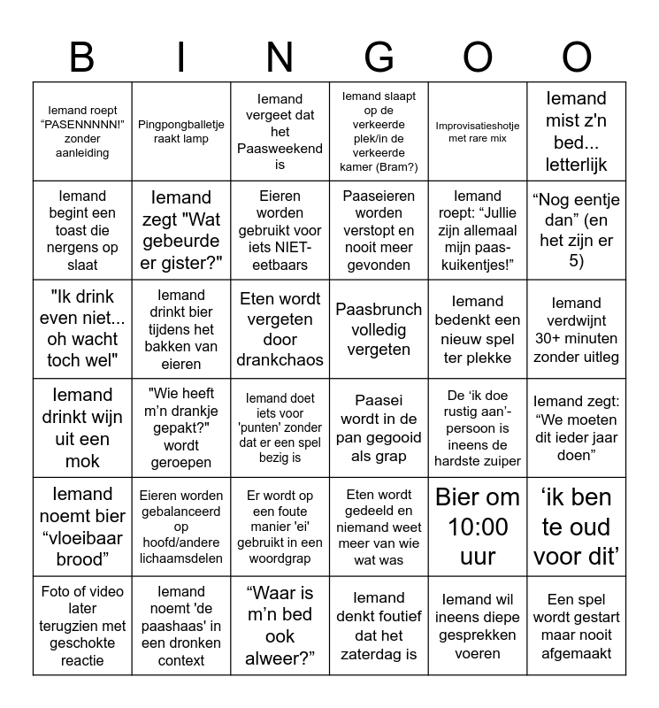 This bingo card has 68 words: Iemand valt in slaap met drankje in de hand, "Ik drink even niet... oh wacht toch wel", Shotje zonder reden, Iemand noemt 'de paashaas' in een dronken context, Bier om 10:00 uur, Iemand zegt "We beginnen rustig aan dit weekend", Pingpongballetje raakt lamp, Paasei wordt gebruikt in een drankspel, Iemand zegt "Wat gebeurde er gister?", Drinkspel escaleert binnen 3 minuten, Iemand verdwijnt 30+ minuten zonder uitleg, Fles drank sneuvelt letterlijk, Eten wordt vergeten door drankchaos, Improvisatieshotje met rare mix, Paashaas maakt een verschijning (kostuum of iemand die denkt dat-ie het is), Iemand mist z'n bed... letterlijk, “Nog eentje dan” (en het zijn er 5), Iemand roept “PASENNNNN!” zonder aanleiding, Biertje mee naar toilet, Iemand bedenkt een nieuw spel ter plekke, Eieren worden gebruikt voor iets NIET-eetbaars, Iemand drinkt wijn uit een mok, Paasbrunch volledig vergeten, Iemand noemt bier “vloeibaar brood”, Foute drankmix ("Wie doet er cola in wijn?!"), Paaseitje in een drankje gedropt (en opgedronken), Iemand wil ineens diepe gesprekken voeren, Een spel wordt gestart maar nooit afgemaakt, "Wie heeft m’n drankje gepakt?" wordt geroepen, Dansen op een foute klassieker (denk: Snollebollekes of K3), Iemand vergeet dat het Paasweekend is, “Ik voel niks hoor” (5 minuten later: chaos), “Ik heb écht geen kater” (leugen), “Wie heeft er eieren verstopt in m’n tas?”, Iemand slaapt op de verkeerde plek/in de verkeerde kamer (Bram?), Foto of video later terugzien met geschokte reactie, Iemand maakt een paas-selfie met een biertje als bunny-oortjes, Iemand doet iets voor 'punten' zonder dat er een spel bezig is, Paaseieren worden verstopt en nooit meer gevonden, Iemand roept: “Jullie zijn allemaal mijn paas-kuikentjes!”, Eieren worden gebalanceerd op hoofd/andere lichaamsdelen, Iemand stelt voor om karaoke te doen (en meent het), Iemand begint een toast die nergens op slaat, Drankje wordt geheven op “de paashaas”, Het eerste drankspel begint voor het ontbijt, Iemand gebruikt een paasei als dobbelsteen, Iemand denkt foutief dat het zaterdag is, “Waar is m’n bed ook alweer?”, Iemand drinkt bier tijdens het bakken van eieren, Paasei wordt in de pan gegooid als grap, Eten wordt gedeeld en niemand weet meer van wie wat was, Er worden chips met hummus en paaseieren gegeten als ‘luxe snack’, Iemand is alleen maar bezig met snacks, De ‘ik doe rustig aan’-persoon is ineens de hardste zuiper, Iemand probeert een ei met z’n voorhoofd te breken, Er wordt een nieuwe paasreligie bedacht (drankgerelateerd), Iemand zegt: “We moeten dit ieder jaar doen”, De paashaas krijgt een nieuwe bijnaam, Een ei rolt van tafel en wordt ceremonieel begraven, ‘ik ben te oud voor dit’, Iemand valt van stoel, Iemand verdwijnt verdacht lang naar de wc, Iemand neemt per ongeluk andermans drankje, Er wordt een drankspel half uitgelegd, dan direct vergeten, Iemand zegt: “Ik drink écht even niet meer” → 10 min later: shotje, Iemand valt/struikelt over niks, Er wordt op een foute manier 'ei' gebruikt in een woordgrap and Iemand gebruikt een voorwerp als microfoon.
