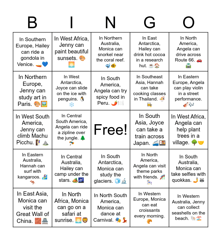 This bingo card has a free space and 34 words: In East Asia, Angela can ride a camel through the desert. π«, In Western Europe, Monica can eat croissants every morning. π₯, In Southern Africa, Jenny can dance with friendly elephants. ππ, In North South America, Hailey can explore the Amazon rainforest. π³π¦, In Eastern Australia, Hannah can surf with kangaroos. πββοΈπ¦, In West Antarctica, Joyce can slide on the ice with penguins. π§βοΈ, In North America, Angela can drive across Route 66. ππ£οΈ, In East Asia, Monica can visit the Great Wall of China. π§±π―, In West Africa, Jenny can paint beautiful sunsets. π¨π , In Northern Europe, Hailey can tour castles with her best friend. π°π―ββοΈ, In South America, Angela can try spicy food in Peru. πΆοΈπ½οΈ, In Northern Australia, Monica can snorkel near the coral reef. π€Ώπ , In East Antarctica, Jenny can build a snow fort with scientists. βοΈπ°, In North America, Hailey can watch fireworks in New York. ππ½, In South Asia, Joyce can take a train across Japan. ππ±, In Eastern Europe, Angela can play violin in a street performance. π»πΆ, In North Africa, Monica can go on a safari at sunrise. π π¦, In West South America, Jenny can climb Machu Picchu. π§ββοΈβ°οΈ, In Central Australia, Hailey can camp under the stars. ποΈπ, In North America, Angela can visit theme parks with friends. π’π , In South Antarctica, Monica can study the glaciers. π§π¬, In Southeast Asia, Jenny can write poems in a cherry blossom garden. πΈπ, In Southern Europe, Hailey can ride a gondola in Venice. π€π, In West Africa, Angela can help plant trees in a village. π³π€, In North South America, Monica can dance at Carnival. ππ, In Western Australia, Jenny can collect seashells on the beach. πποΈ, In East Antarctica, Hailey can drink hot cocoa in a research hut. βπ , In Western North America, Monica can ski in the Rocky Mountains. πΏποΈ, In Southeast Asia, Hannah can take cooking classes in Thailand. ππ©βπ³, In Northern Europe, Jenny can study art in Paris. π¨πΌοΈ, In Southern Africa, Hailey can learn to play the drums. πͺπ΅, In Central South America, Angela can ride a zipline over the jungle. π²πͺ, In South Australia, Monica can take selfies with quokkas. π€³π¦ and In Eastern North America, Jenny can visit museums in Washington, D.C. ποΈπ§ .
