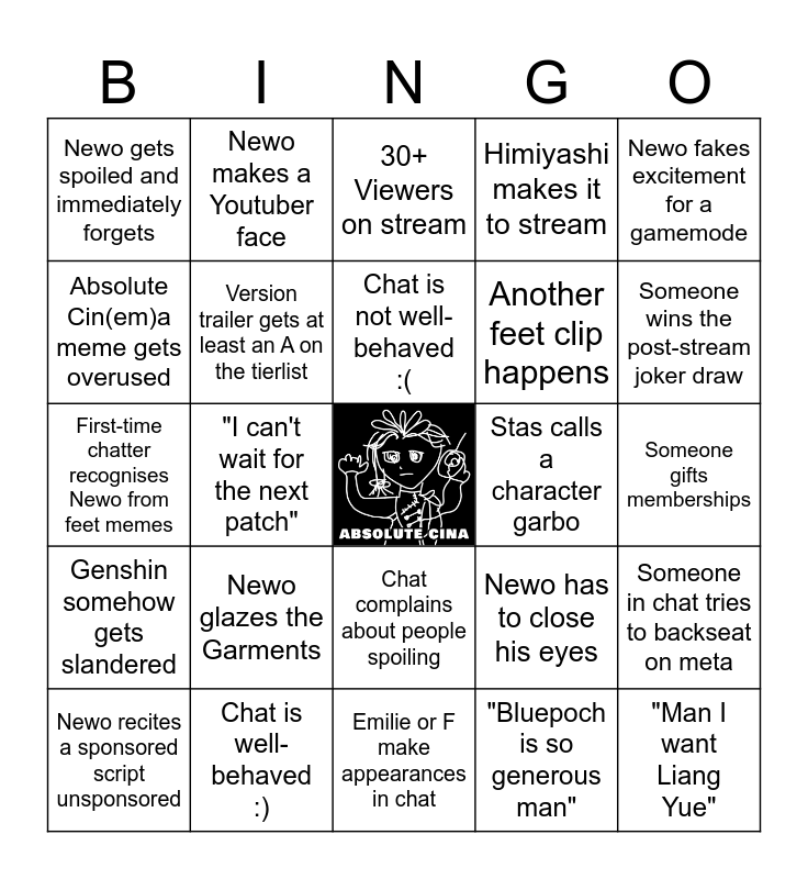 This bingo card has a free space and 24 words: Newo glazes the Garments, Chat is well-behaved :), Chat is not well-behaved :(, Newo recites a sponsored script unsponsored, Newo fakes excitement for a gamemode, Newo gets spoiled and immediately forgets, Absolute Cin(em)a meme gets overused, Newo makes a Youtuber face, Stas calls a character garbo, Chat complains about people spoiling, Another feet clip happens, First-time chatter recognises Newo from feet memes, Newo has to close his eyes, Someone in chat tries to backseat on meta, Version trailer gets at least an A on the tierlist, "Bluepoch is so generous man", Someone gifts memberships, 30+ Viewers on stream, Someone wins the post-stream joker draw, "I can't wait for the next patch", "Man I want Liang Yue", Genshin somehow gets slandered, Himiyashi makes it to stream and Emilie or F make appearances in chat.