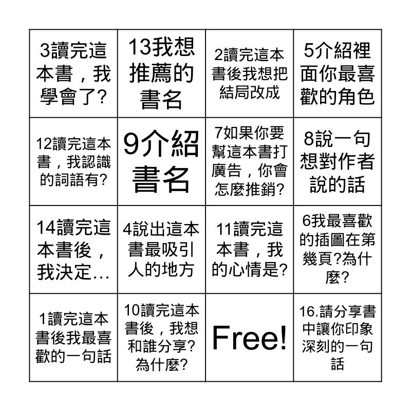 This bingo card has 17 words: Free!, 1讀完這本書後我最喜歡的一句話, 2讀完這本書後我想把結局改成, 3讀完這本書,我學會了?, 4說出這本書最吸引人的地方, 5介紹裡面你最喜歡的角色, 6我最喜歡的插圖在第幾頁?為什麼?, 7如果你要幫這本書打廣告,你會怎麼推銷?, 8說一句想對作者說的話, 9介紹書名, 10讀完這本書後,我想和誰分享?為什麼?, 11讀完這本書,我的心情是?, 12讀完這本書,我認識的詞語有?, 13我想推薦的書名, 14讀完這本書後,我決定…, 15.我最想跟書中的誰當朋友,為什麼? and 16.請分享書中讓你印象深刻的一句話.