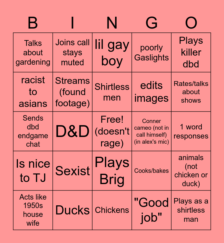This bingo card has a free space and 24 words: Sexist, Ducks, Shirtless men, Acts like 1950s house wife, Plays killer dbd, Talks about gardening, racist to asians, Joins call stays muted, Conner cameo (not in call himself) (in alex's mic), Plays Brig, edits images, Sends dbd endgame chat, Cooks/bakes, animals (not chicken or duck), Streams (found footage), "Good job", 1 word responses, lil gay boy, Rates/talks about shows, D&D, Plays as a shirtless man, Is nice to TJ, poorly Gaslights and Chickens.