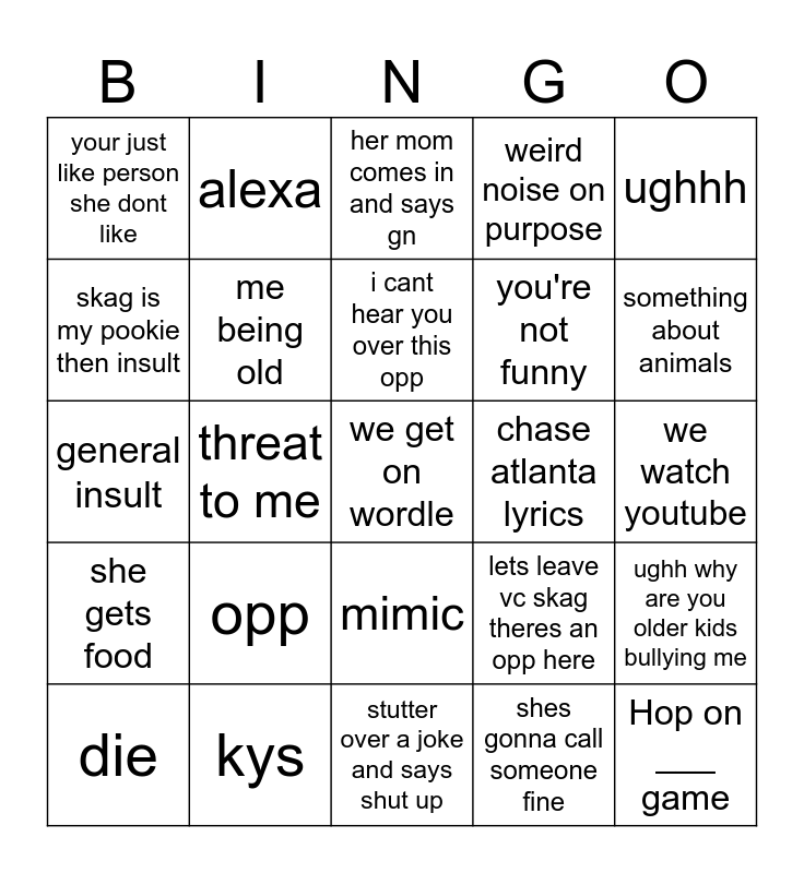 This bingo card has a free space and 24 words: opp, kys, i cant hear you over this opp, die, ughhh, your just like person she dont like, skag is my pookie then insult, alexa, chase atlanta lyrics, mimic, you're not funny, general insult, lets leave vc skag theres an opp here, ughh why are you older kids bullying me, me being old, shes gonna call someone fine, we watch youtube, her mom comes in and says gn, something about animals, threat to me, Hop on ___ game, she gets food, weird noise on purpose and stutter over a joke and says shut up.