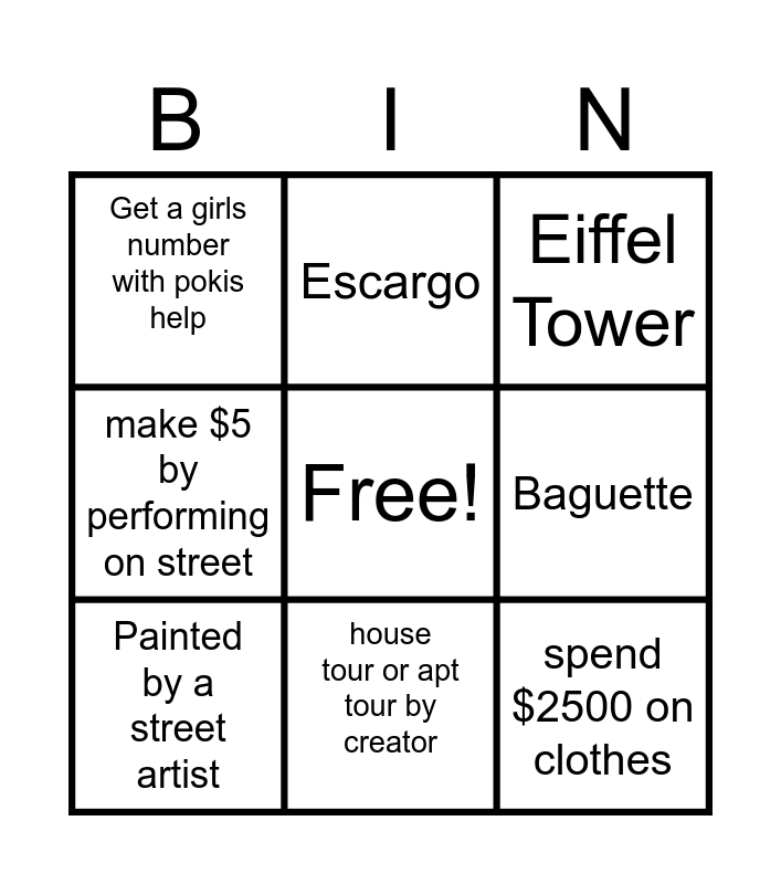 This bingo card has a free space and 8 words: Baguette, Eiffel Tower, Escargo, Painted by a street artist, Get a girls number with pokis help, spend $2500 on clothes, make $5 by performing on street and house tour or apt tour by creator.