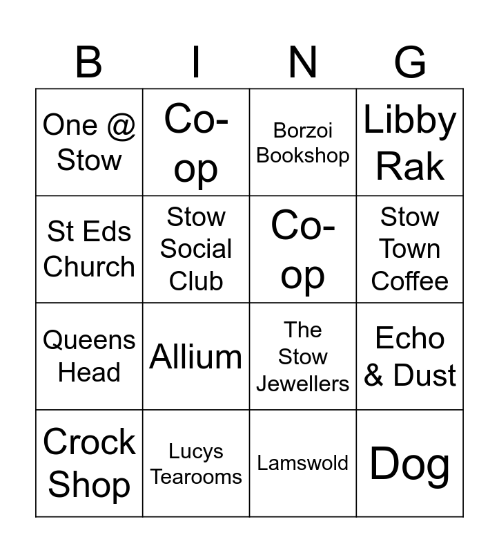 This bingo card has 27 words: 1. Co-op, Free!, Queens Head, The Porch, Stow Social Club, Borzoi Bookshop, Co-op, Dog, Lucys Tearooms, D’ambrosi, The Stow Jewellers, Libby Rak, Off the Square, Knight Frank, Allium, Tesco, Co-op, Stow Town Coffee, Flapjackery, One @ Stow, Lamswold, Stow Lodge, Echo & Dust, Crock Shop, The Avenue, St Eds Church and Baptist Church.