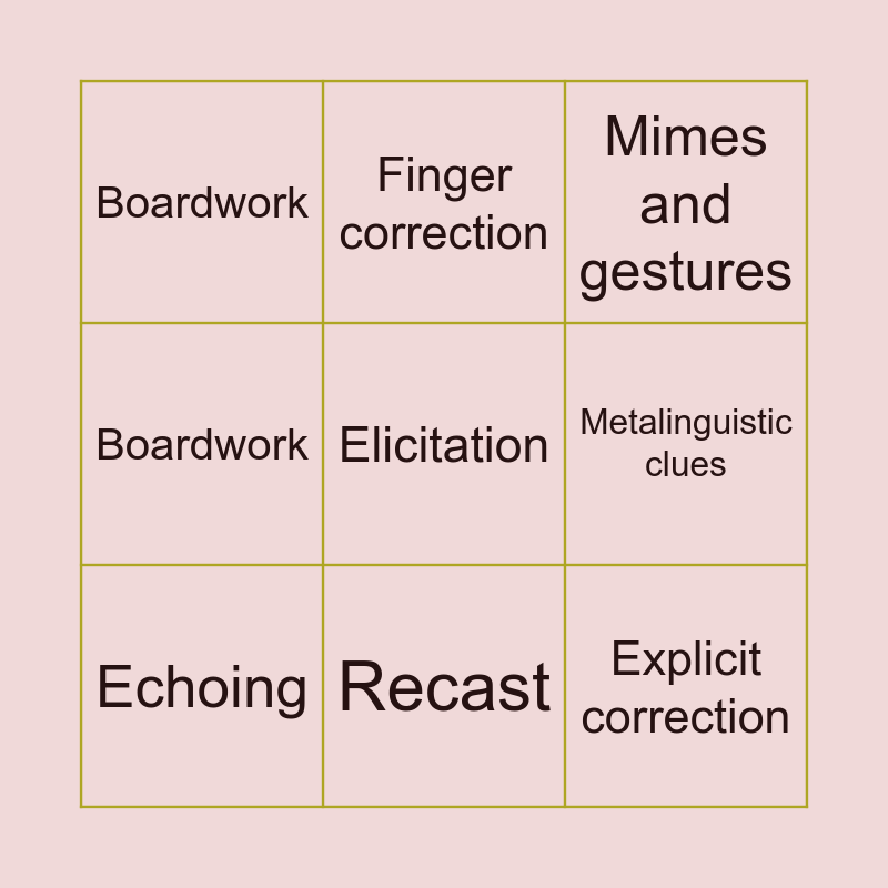 This bingo card has 11 words: Explicit correction, Recast, Elicitation, Echoing, Finger correction, Mimes and gestures, Metalinguistic clues, Clarification, Boardwork, Boardwork and Finger correction.