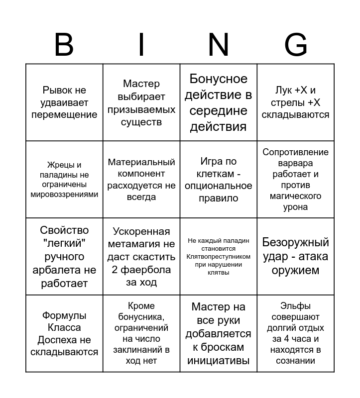 This bingo card has 16 words: Кроме бонусника, ограничений на число заклинаний в ход нет, Безоружный удар - атака оружием, Бонусное действие в середине действия, Рывок не удваивает перемещение, Свойство "легкий" ручного арбалета не работает, Мастер выбирает призываемых существ, Не каждый паладин становится Клятвопреступником при нарушении клятвы, Мастер на все руки добавляется к броскам инициативы, Жрецы и паладины не ограничены мировоззрениями, Материальный компонент расходуется не всегда, Формулы Класса Доспеха не складываются, Лук +Х и стрелы +Х складываются, Ускоренная метамагия не даст скастить 2 фаербола за ход, Сопротивление варвара работает и против магического урона, Игра по клеткам - опциональное правило and Эльфы совершают долгий отдых за 4 часа и находятся в сознании.