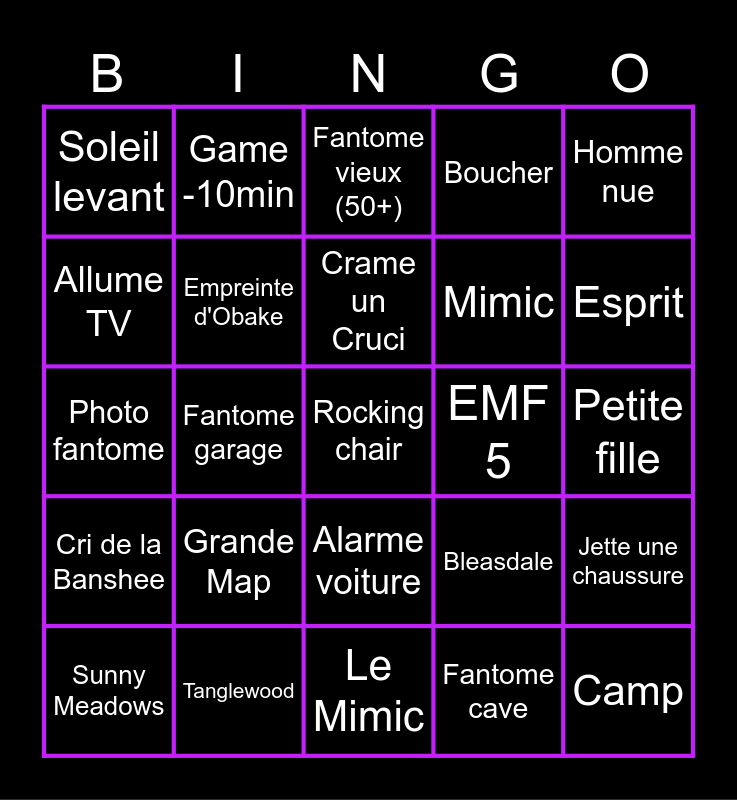 This bingo card has 195 words: Banshee, Cauchemar, Démon, Deogen, Djinn, Esprit, Fantôme, Goryo, Hantu, Mimic, Jumeaux, Moroï, Myling, Obake, Ombre, Oni, Onryo, Poltergeist, Raiju, Revenant, Spectre, Thayé, Yokai, Yurei, Tanglewood, Redgeview, Willow, Edgefield, Bleasdale, Grafton, Camp, Sunny Meadows, Ecole, Prison, Boite à musique, Miroir, Tarot, Carte The Hanged Man, Carte The High Priestess, Ouija, Cercle d'invocation, Poupée vaudou, Patte de singe, Mist, Brouillard, Neige, Soleil levant, Sadako, Petite fille, Homme nue, Boucher, Photo fantome, Photo DOTS, Eau sale, Douche, Guitare, Piano, Rocking chair, Ventilateur, Allume TV, Telephone qui vibre/sonne, Alarme voiture, Lumière rouge, Explose lumière, Fantome chante, Fantome cave, Fantome grenier, Fantome garage, Game parfaite, Game sans preuve, Game fantome 150%, Game sans lumière, Game -10min, Colonne vertébrale, Crane, Cage thoracique, Cri de la Banshee, Cri du Deogen, Fantome vieux (50+), Fantome jeune (50-), Empreinte fenêtre, Empreinte interrupteur, Survivre sans se cacher, Fantome attaque au dessus de 70%, Crame un Cruci, Banshee, Cauchemar, Démon, Deogen, Djinn, Esprit, Fantôme, Goryo, Hantu, Le Mimic, Les Jumeaux, Moroï, Myling, Obake, Ombre, Oni, Onryo, Poltergeist, Raiju, Revenant, Spectre, Thayé, Yokai, Yurei, Tanglewood, Redgeview, Willow, Edgefield, Bleasdale, Grafton, Camp, Sunny Meadows, Ecole, Prison, Boite à musique, Miroir, Tarot, Carte The Hanged Man, Carte The High Priestess, Ouija, Cercle d'invocation, Poupée vaudou, Patte de singe, Réanimer sans mourir, Brouillard, Neige, Soleil levant, Sadako, Petite fille, Homme nu, Boucher, Photo fantome, Photo DOTS, Eau sale, Douche, Guitare, Piano, Rocking chair, Ventilateur, Allume TV, Telephone qui vibre/sonne, Alarme voiture, Lumière rouge, Explose lumière, Fantome chante, Fantome cave, Fantome grenier, Fantome garage, Game parfaite, Game sans preuve, Game fantome 150%, Game sans lumière, Game -10min, Colonne vertébrale, Crane, Cage thoracique, Cri de la Banshee, Cri du Deogen, Fantome vieux (50+), Fantome jeune (50-), Empreinte fenêtre, Empreinte interrupteur, Survivre sans se cacher, Fantome attaque au dessus de 70%, Crame un Cruci, Tourne sa tete, Ecriture, Fait tomber un cadre, Jette une chaussure, Jette une assiette, Jette un couvert, Coupe le courant, Orbe fantomatique, Souffle une bougie, Entité joue du piano, Allume une lampe, Allume la radio, Blood Moon, Sylroc meurt, Sylroc crie "putain", Sylroc sursaute, Empreinte d'Obake, Grande Map, Petite Map, Map Moyenne, Sylroc oublie son briquet, Spirit Box, Spirit Box, EMF 5 and EMF 5.