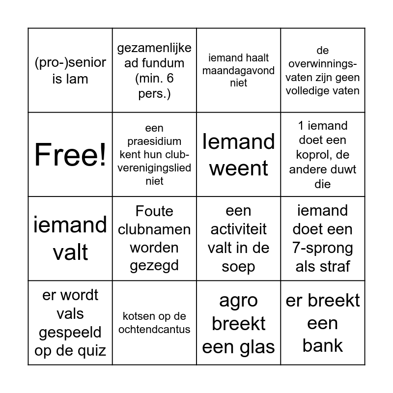 This bingo card has 16 words: kotsen op de ochtendcantus, iemand doet een 7-sprong als straf, iemand haalt maandagavond niet, (pro-)senior is lam, iemand valt, gezamenlijke ad fundum (min. 6 pers.), een activiteit valt in de soep, agro breekt een glas, Free!, een praesidium kent hun club- verenigingslied niet, er wordt vals gespeeld op de quiz, de overwinnings-vaten zijn geen volledige vaten, Foute clubnamen worden gezegd, 1 iemand doet een koprol, de andere duwt die, Iemand weent and er breekt een bank.