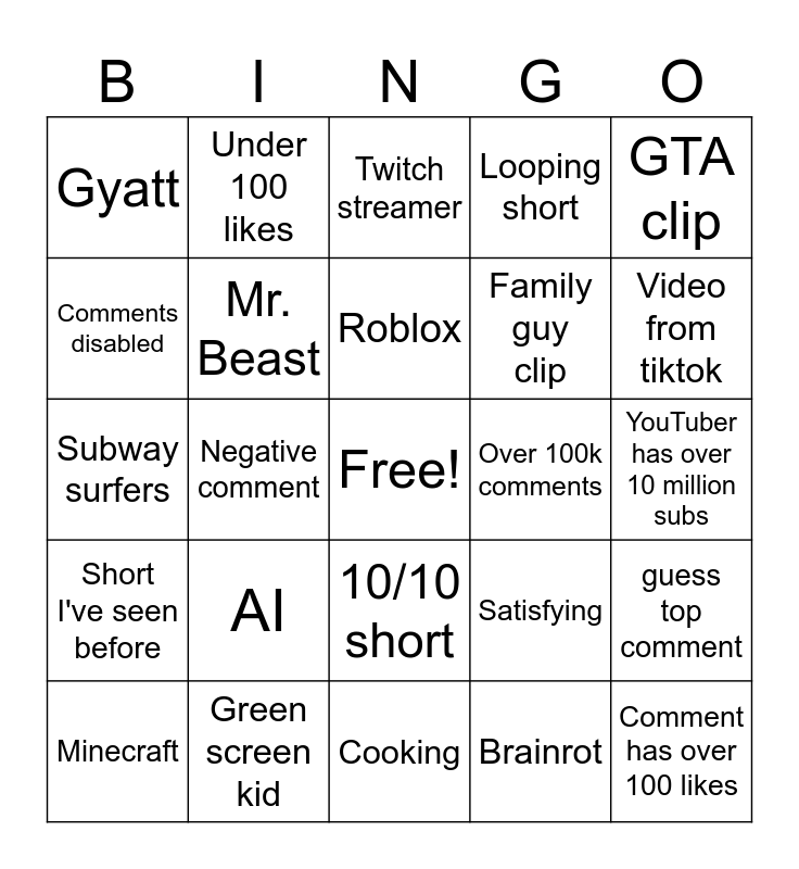 This bingo card has a free space and 24 words: AI, Green screen kid, Roblox, Minecraft, GTA clip, Gyatt, Comments disabled, Under 100 likes, Over 100k comments, 10/10 short, Family guy clip, Subway surfers, Satisfying, guess top comment, Mr. Beast, Brainrot, YouTuber has over 10 million subs, Twitch streamer, Video from tiktok, Negative comment, Comment has over 100 likes, Short I've seen before, Looping short and Cooking.