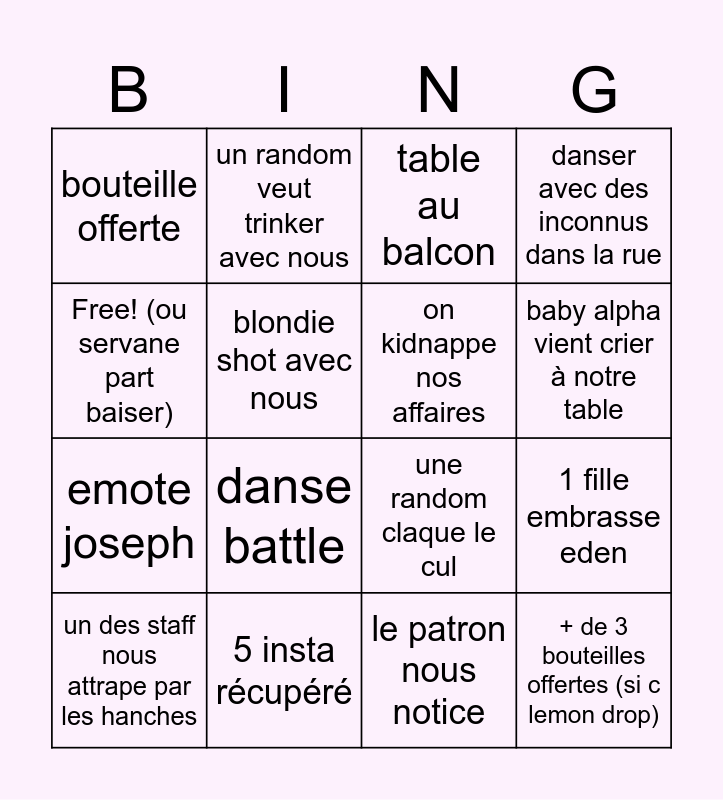 This bingo card has 16 words: 5 insta récupéré, 1 fille embrasse eden, table au balcon, bouteille offerte, emote joseph, un random veut trinker avec nous, une random claque le cul, le patron nous notice, Free! (ou servane part baiser), blondie shot avec nous, un des staff nous attrape par les hanches, danser avec des inconnus dans la rue, danse battle, baby alpha vient crier à notre table, on kidnappe nos affaires and + de 3 bouteilles offertes (si c lemon drop).