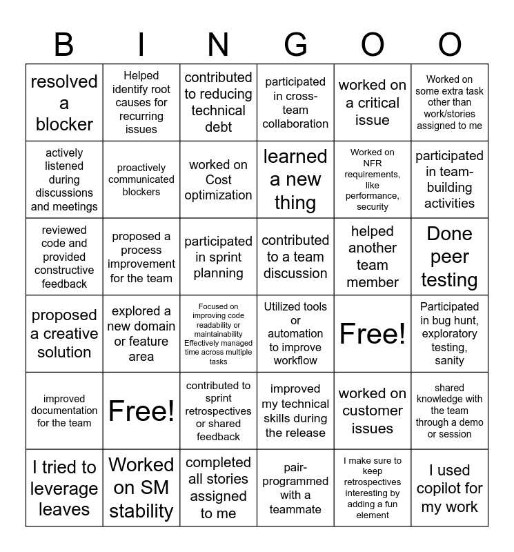 This bingo card has 36 words: improved my technical skills during the release, contributed to sprint retrospectives or shared feedback, pair-programmed with a teammate, actively listened during discussions and meetings, proposed a creative solution, contributed to a team discussion, proactively communicated blockers, completed all stories assigned to me, worked on a critical issue, worked on customer issues, participated in team-building activities, participated in cross-team collaboration, shared knowledge with the team through a demo or session, proposed a process improvement for the team, learned a new thing, resolved a blocker, improved documentation for the team, helped another team member, reviewed code and provided constructive feedback, contributed to reducing technical debt, participated in sprint planning, explored a new domain or feature area, Utilized tools or automation to improve workflow, Focused on improving code readability or maintainability Effectively managed time across multiple tasks, Free!, Helped identify root causes for recurring issues, Worked on NFR requirements, like performance, security, Worked on SM stability, worked on Cost optimization, Worked on some extra task other than work/stories assigned to me, I used copilot for my work, I tried to leverage leaves, Participated in bug hunt, exploratory testing, sanity, Done peer testing, Free! and I make sure to keep retrospectives interesting by adding a fun element.