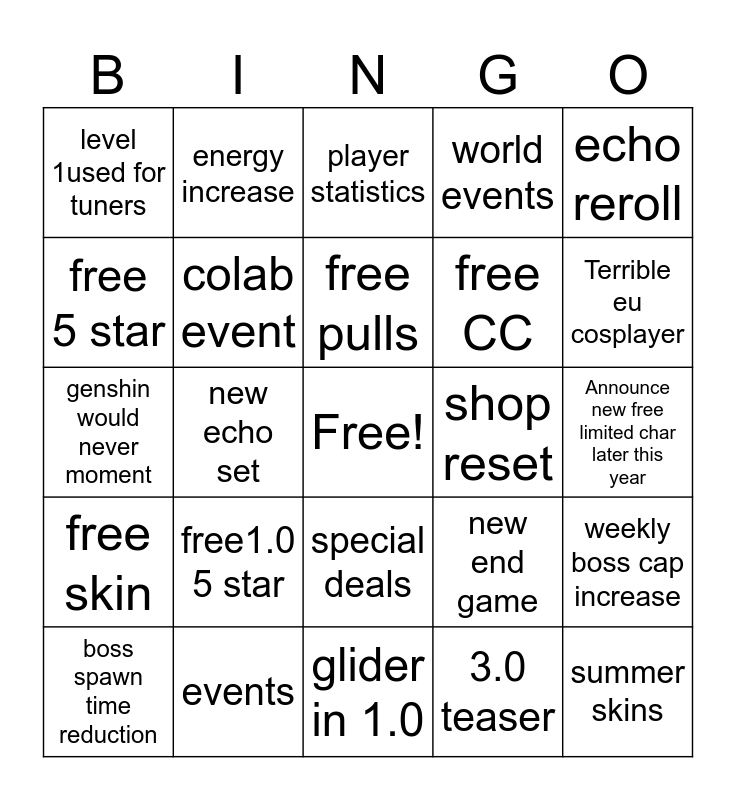 This bingo card has a free space and 24 words: free1.0 5 star, events, free pulls, boss spawn time reduction, echo reroll, level 1used for tuners, free 5 star, energy increase, shop reset, special deals, free CC, genshin would never moment, new end game, weekly boss cap increase, colab event, 3.0 teaser, Announce new free limited char later this year, player statistics, Terrible eu cosplayer, new echo set, summer skins, free skin, world events and glider in 1.0.