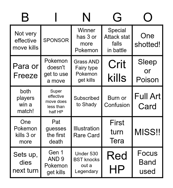 This bingo card has a free space and 24 words: Pat guesses the first death, Gen 1 AND 9 Pokemon get kills, Grass AND Fairy type Pokemon get kills, Sets up, dies next turn, One shotted!, Not very effective move kills, Para or Freeze, SPONSOR, Burn or Confusion, Illustration Rare Card, Crit kills, both players win a match!, First turn Tera, MISS!!, Pokemon doesn't get to use a move, Red HP, Full Art Card, Winner has 3 or more Pokemon, Sleep or Poison, Super effective move does less than half HP, Focus Band used, One Pokemon kills 3 or more, Special Attack stat falls in battle and Under 530 BST knocks out a Legendary.