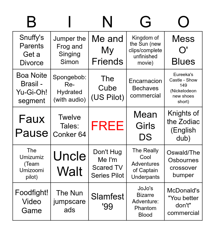 This bingo card has a free space and 24 words: Uncle Walt, The Nun jumpscare ads, The Cube (US Pilot), Foodfight! Video Game, Mess O' Blues, Snuffy's Parents Get a Divorce, Boa Noite Brasil - Yu-Gi-Oh! segment, Jumper the Frog and Singing Simon, Mean Girls DS, Don't Hug Me I'm Scared TV Series Pilot, Encarnacion Bechaves commercial, Faux Pause, The Really Cool Adventures of Captain Underpants, Oswald/The Osbournes crossover bumper, Spongebob: Re-Hydrated (with audio), JoJo's Bizarre Adventure: Phantom Blood, Knights of the Zodiac (English dub), Me and My Friends, Eureeka's Castle - Show 149 (Nickelodeon new shoes short), Twelve Tales: Conker 64, McDonald's "You better don't" commercial, The Umizumiz (Team Umizoomi pilot), Kingdom of the Sun (new clips/complete unfinished movie) and Slamfest '99.
