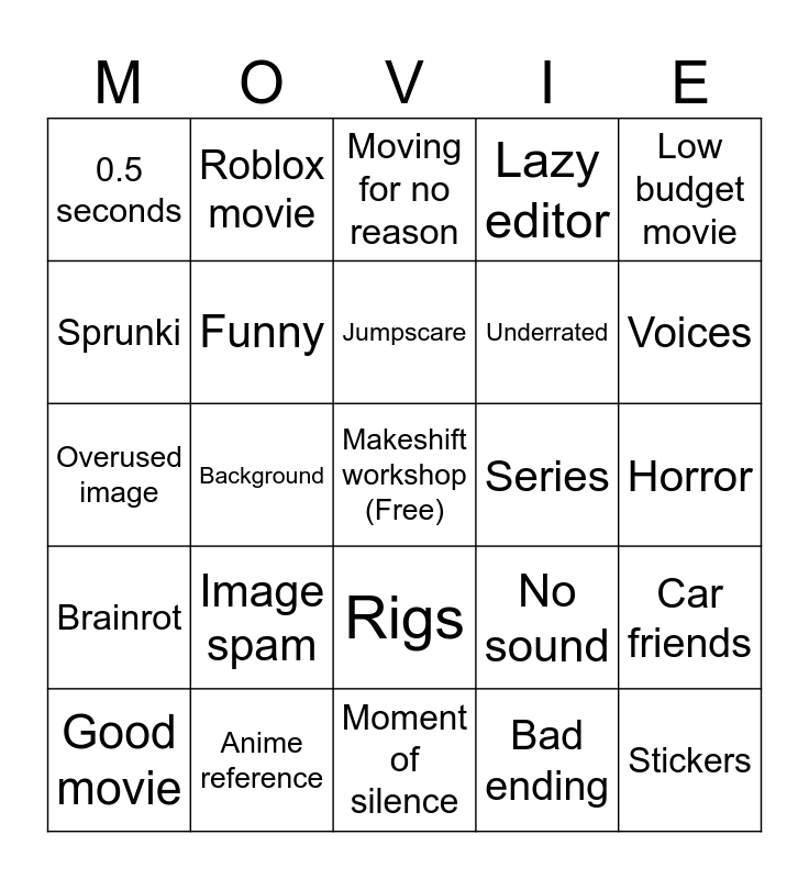 This bingo card has a free space and 24 words: Image spam, Anime reference, Jumpscare, Good movie, Low budget movie, 0.5 seconds, Sprunki, Roblox movie, Series, Rigs, Underrated, Overused image, No sound, Car friends, Funny, Bad ending, Horror, Moving for no reason, Voices, Background, Stickers, Brainrot, Lazy editor and Moment of silence.