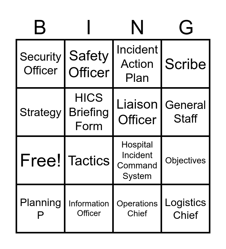 This bingo card has 24 words: Incident Commander, Planning Chief, Operations Chief, Logistics Chief, Security Officer, Safety Officer, Liaison Officer, Scribe, Free!, Information Officer, Command Staff, General Staff, Medical Staff Director, Admin/Finance Chief, Hospital Incident Command System, EM Log, Planning P, HICS Briefing Form, Issues, Objectives, Strategy, Tactics, Incident Action Plan and Incident Priorities.