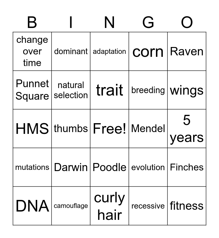 This bingo card has a free space and 24 words: Darwin, camouflage, trait, DNA, Raven, change over time, Punnet Square, dominant, Mendel, Poodle, breeding, HMS, evolution, Finches, natural selection, recessive, 5 years, adaptation, wings, thumbs, fitness, mutations, corn and curly hair.