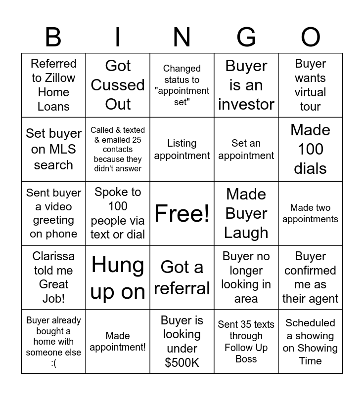 This bingo card has a free space and 24 words: Hung up on, Made appointment!, Listing appointment, Buyer already bought a home with someone else :(, Buyer wants virtual tour, Referred to Zillow Home Loans, Set buyer on MLS search, Got Cussed Out, Made Buyer Laugh, Got a referral, Set an appointment, Sent buyer a video greeting on phone, Buyer no longer looking in area, Buyer confirmed me as their agent, Called & texted & emailed 25 contacts because they didn't answer, Sent 35 texts through Follow Up Boss, Made two appointments, Changed status to "appointment set", Made 100 dials, Spoke to 100 people via text or dial, Scheduled a showing on Showing Time, Clarissa told me Great Job!, Buyer is an investor and Buyer is looking under $500K.