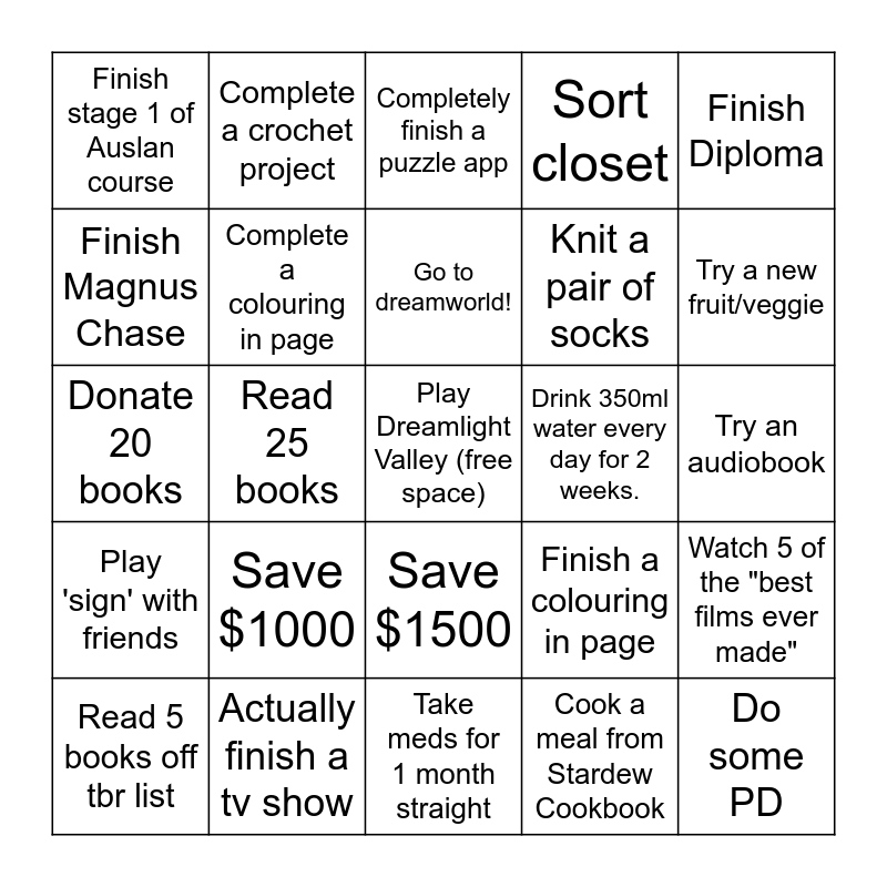 This bingo card has a free space and 24 words: Save $1000, Actually finish a tv show, Go to dreamworld!, Read 5 books off tbr list, Finish Diploma, Finish stage 1 of Auslan course, Finish Magnus Chase, Complete a crochet project, Drink 350ml water every day for 2 weeks., Save $1500, Knit a pair of socks, Donate 20 books, Finish a colouring in page, Watch 5 of the "best films ever made", Complete a colouring in page, Cook a meal from Stardew Cookbook, Try an audiobook, Completely finish a puzzle app, Try a new fruit/veggie, Read 25 books, Do some PD, Play 'sign' with friends, Sort closet and Take meds for 1 month straight.