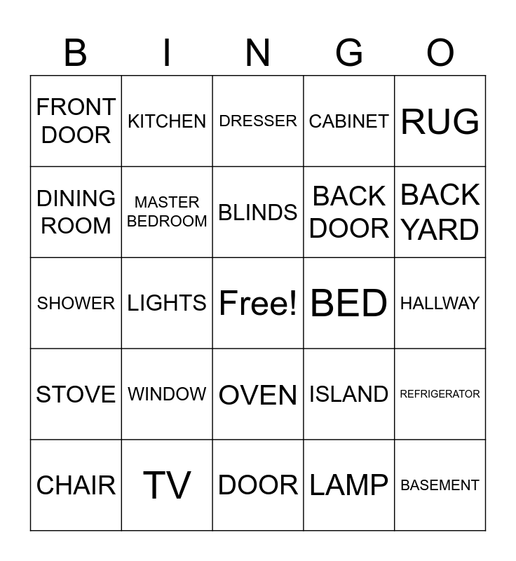 This bingo card has a free space and 49 words: HOME, BASEMENT, ATTIC, DOOR, WINDOW, FLOOR, KITCHEN, LIVING ROOM, DINING ROOM, BATHROOM, MASTER BEDROOM, CABINET, REFRIGERATOR, ISLAND, SINK, CURTAINS, BLINDS, BED, TABLE, RUG, LIGHTS, LAMP, FRONT DOOR, BACK DOOR, FRONT YARD, BACK YARD, CHAIR, COUCH, OVEN, STOVE, DISHWASHER, FIREPLACE, PLANT, FLOWER, TV, GARAGE, PILLOW, CEILING FAN, HALLWAY, STAIRS, THINGS, MICROWAVE, BATHTUB, CLOSET, SHOWER, DRESSER, ENTER, MIRROR and FURNITURE.