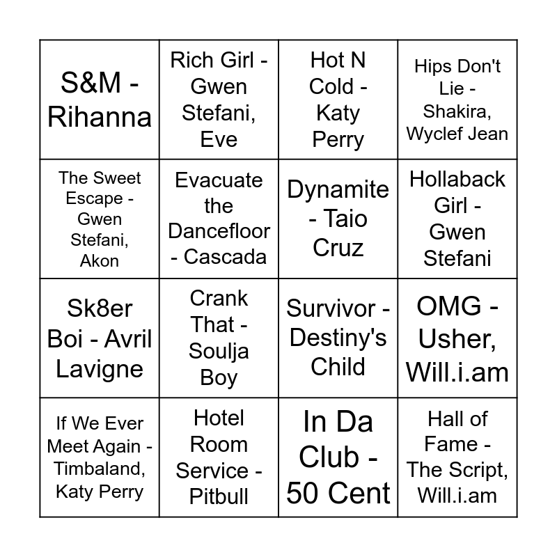 This bingo card has 47 words: Free!, If We Ever Meet Again - Timbaland, Katy Perry, Toxic - Britney Spears, Tik Tok - Kesha, Where Them Girls At - David Guetta, Flo Rida, Nicki Minaj, Everytime We Touch - Cascada, Rich Girl - Gwen Stefani, Eve, Pon de Replay - Rihanna, Evacuate the Dancefloor - Cascada, Like A G6 - Far East Movement, The Cataracs, DEV, Dynamite - Taio Cruz, Hips Don't Lie - Shakira, Wyclef Jean, Telephone - Lady Gaga, Beyoncé, Club Can't Handle Me - Flo Rida, David Guetta, Low - Flo Rida, T-Pain, Stronger - Kanye West, Hollaback Girl - Gwen Stefani, Hotel Room Service - Pitbull, 7 Things - Miley Cyrus, The Sweet Escape - Gwen Stefani, Akon, OMG - Usher, Will.i.am, Super Bass - Nicki Minaj, S&M - Rihanna, Sk8er Boi - Avril Lavigne, 4 Minutes - Madonna, Justin Timberlake, Timbaland, Crank That - Soulja Boy, Your Love Is My Drug – Kesha, Beautiful Girls - Sean Kingston, Give My Everything - Pitbull, Afrojack, Ne-yo, Nayer, Hall of Fame - The Script, Will.i.am, We Are Young - Fun, Janelle Monáe, Memories - David Guetta, Kid Cudi, No One - Alicia Keys, When I Grow Up - The Pussycat Dolls, Price Tag - Jessie J, B.o.B, Just A Dream - Nelly, In Da Club - 50 Cent, Raise Your Glass - P!nk, Since U Been Gone - Kelly Clarkson, Beep - The Pussycat Dolls, Will.i.am, A Thousand Miles - Vanessa Carlton, Hot N Cold - Katy Perry, Survivor - Destiny's Child, Domino - Jessie J, Crazy in Love - Beyoncé, Jay-Z, You're Beautiful - James Blunt and The Real Slim Shady - Eminem.