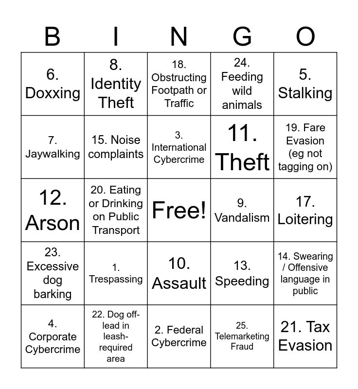 This bingo card has a free space and 25 words: 1. Trespassing, 2. Federal Cybercrime, 3. International Cybercrime, 4. Corporate Cybercrime, 5. Stalking, 6. Doxxing, 7. Jaywalking, 8. Identity Theft, 9. Vandalism, 10. Assault, 11. Theft, 12. Arson, 13. Speeding, 14. Swearing / Offensive language in public, 15. Noise complaints, 16. Public Urination, 17. Loitering, 18. Obstructing Footpath or Traffic, 19. Fare Evasion (eg not tagging on), 20. Eating or Drinking on Public Transport, 21. Tax Evasion, 22. Dog off-lead in leash-required area, 23. Excessive dog barking, 24. Feeding wild animals and 25. Telemarketing Fraud.