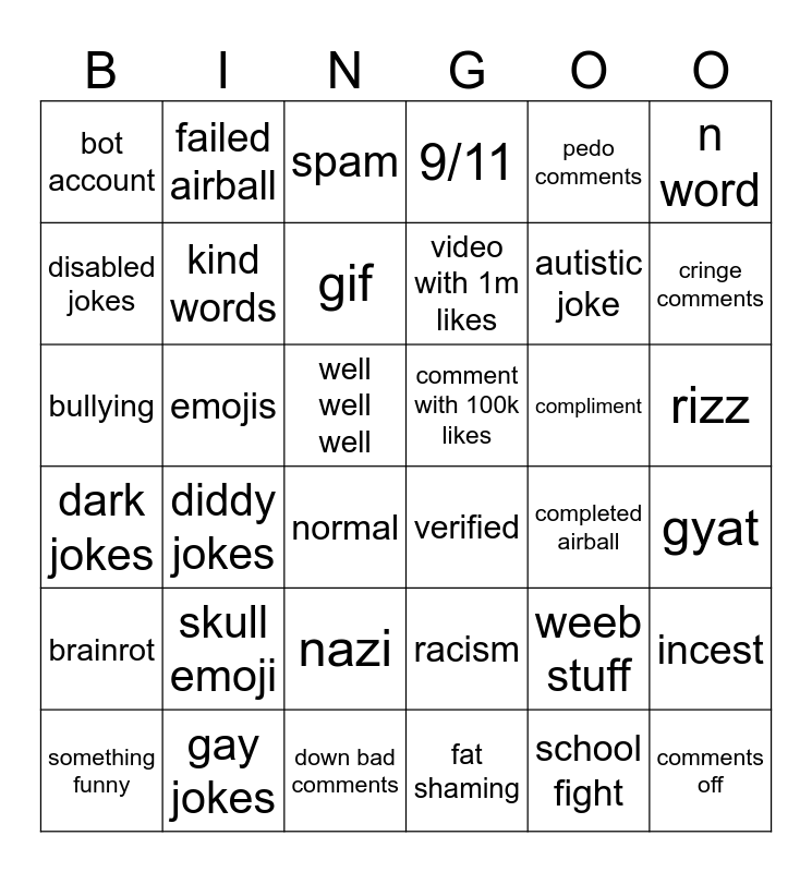 This bingo card has 36 words: racism, nazi, fat shaming, disabled jokes, dark jokes, comment with 100k likes, kind words, down bad comments, pedo comments, weeb stuff, cringe comments, 9/11, incest, emojis, video with 1m likes, bot account, brainrot, compliment, bullying, spam, well well well, diddy jokes, verified, normal, completed airball, failed airball, autistic joke, gay jokes, gif, n word, comments off, something funny, gyat, rizz, skull emoji and school fight.