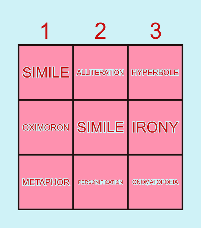 This bingo card has 9 words: METAPHOR, HYPERBOLE, ALLITERATION, OXIMORON, SIMILE, IRONY, SIMILE, ONOMATOPOEIA and PERSONIFICATION.