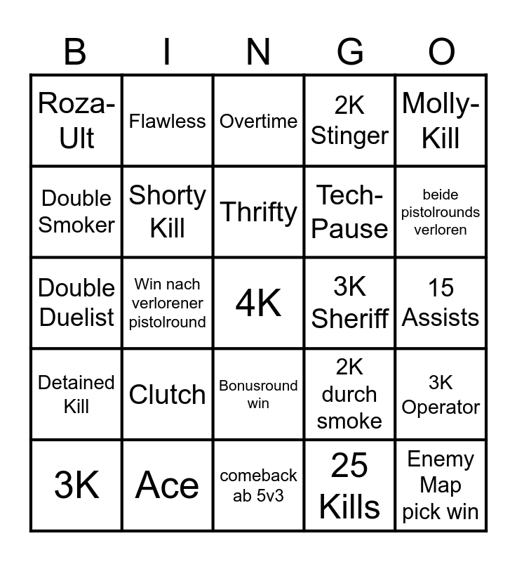 This bingo card has a free space and 24 words: Clutch, Ace, Thrifty, 3K, Molly-Kill, Roza-Ult, Double Smoker, Flawless, 3K Sheriff, Bonusround win, Tech-Pause, Double Duelist, 2K durch smoke, 3K Operator, Shorty Kill, 25 Kills, 15 Assists, Overtime, beide pistolrounds verloren, Win nach verlorener pistolround, Enemy Map pick win, Detained Kill, 2K Stinger and comeback ab 5v3.