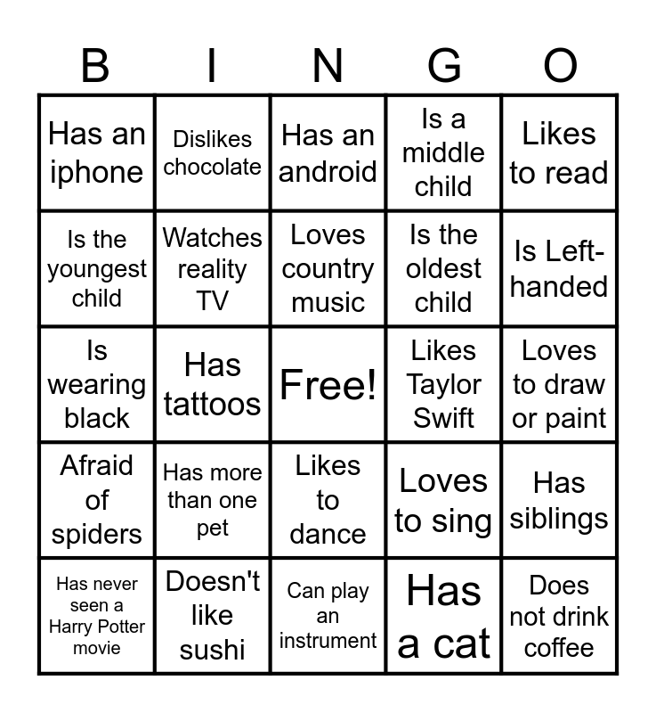 This bingo card has a free space and 31 words: Can play an instrument, Been on a blind date, Has tattoos, Wears glasses, Has an iphone, Has an android, Watches reality TV, Loves to sing, Likes Taylor Swift, Has a cat, Loves to draw or paint, Does not drink coffee, Plays video games, Has traveled to another country, Is Left-handed, Is an only child, Has siblings, Has more than one pet, Afraid of spiders, Likes to dance, Likes to read, Loves to cook or bake, Has never seen a Harry Potter movie, Dislikes chocolate, Is the oldest child, Is the youngest child, Is a middle child, Is wearing black, Doesn't like sushi, Loves country music and Has a food allergy.