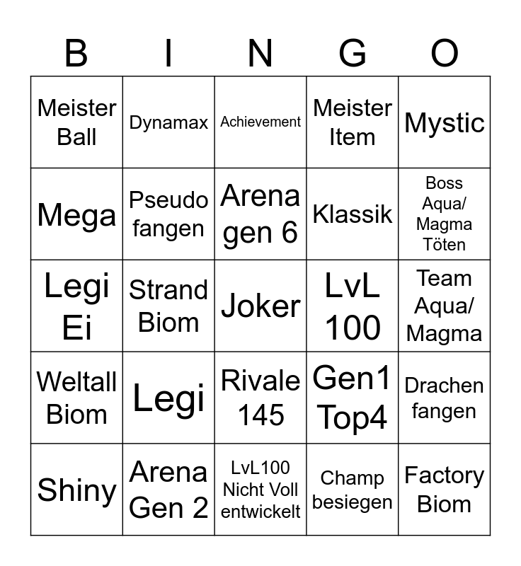 This bingo card has a free space and 24 words: Legi, Arena Gen 2, Arena gen 6, Shiny, Mystic, Meister Ball, Mega, Dynamax, LvL 100, Rivale 145, Klassik, Legi Ei, Gen1 Top4, Drachen fangen, Pseudo fangen, Champ besiegen, Team Aqua/ Magma, Achievement, Boss Aqua/ Magma Töten, Strand Biom, Factory Biom, Weltall Biom, Meister Item and LvL100 Nicht Voll entwickelt.