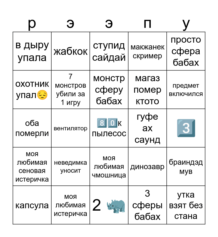 This bingo card has 25 words: неведимка уносит, 2 🦏, монстр сферу бабах, капсула, просто сфера бабах, в дыру упала, охотник упал😔, жабкок, гуфе ах саунд, моя любимая чмошница, магаз помер ктото, оба померли, динозавр, браиндэд мув, 7 монстров убили за 1 игру, утка взят без стана, 3️⃣, ступид сайдай, предмет включился, вентилятор, 8️⃣0️⃣к пылесос, моя любимая истеричка, моя любимая сеновая истеричка, макжанек скример and 3 сферы бабах.