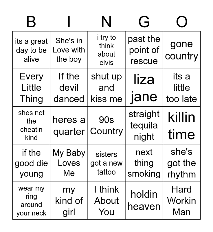 This bingo card has a free space and 52 words: Country Club, Hard Workin Man, Hill Billy Rock, I think About You, My Baby Loves Me, No Time to KIll, She's in Love with the boy, Trashy Woman, Every Little Thing, Guys Do It all the time, If the devil danced, old flames have a new name, she's got the rhythm, next thing smoking, old enough to know better, only here for a little while, shut up and kiss me, straight tequila night, Cadillac style, gone country, heres a quarter, holdin heaven, its a great day to be alive, liza jane, poor poor pitiful me, tempted, wrong side of memphis, you cant take the country out of me, its a little too late, jesus and mama, lord have mercy on the working man, past the point of rescue, what ya gonna do with a cowboy, bubba shot the jukebox, first time for everything, i try to think about elvis, my kind of girl, texas tattoo, whos cheating who, You aint much fun, love without end amen, killin time, if the good die young, jealous bone, sisters got a new tattoo, third rate romance, we just disagree, shes not the cheatin kind, better class of losers, workin mans ph.d, wear my ring around your neck and i feel lucky.