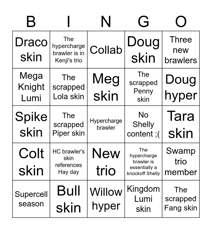 This bingo card has a free space and 24 words: HC brawler's skin references Hay day, Bull skin, Meg skin, Supercell season, Three new brawlers, Draco skin, Mega Knight Lumi, The hypercharge brawler is in Kenji's trio, No Shelly content ;(, New trio, The scrapped Penny skin, Spike skin, The hypercharge brawler is essentially a knockoff Shelly, Swamp trio member, The scrapped Lola skin, Kingdom Lumi skin, Tara skin, Collab, Doug hyper, The scrapped Piper skin, The scrapped Fang skin, Colt skin, Doug skin and Willow hyper.