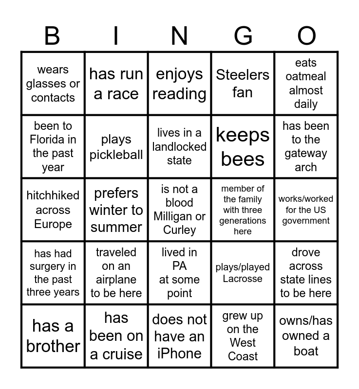 This bingo card has 25 words: traveled on an airplane to be here, does not have an iPhone, lives in a landlocked state, has a brother, eats oatmeal almost daily, wears glasses or contacts, been to Florida in the past year, has run a race, member of the family with three generations here, lived in PA at some point, keeps bees, hitchhiked across Europe, plays/played Lacrosse, drove across state lines to be here, plays pickleball, owns/has owned a boat, works/worked for the US government, enjoys reading, has been to the gateway arch, prefers winter to summer, is not a blood Milligan or Curley, has been on a cruise, has had surgery in the past three years, Steelers fan and grew up on the West Coast.