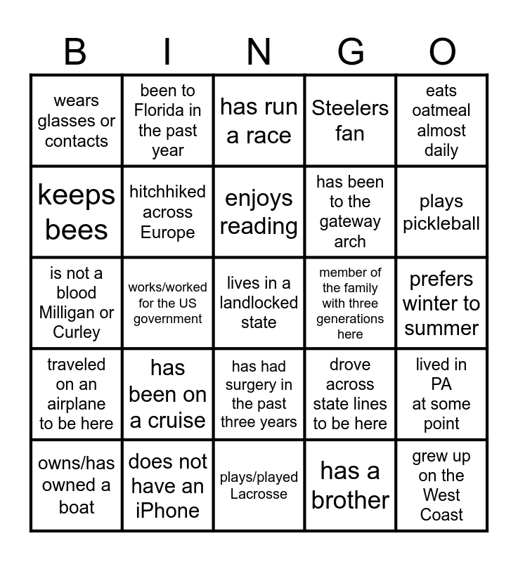 This bingo card has 25 words: traveled on an airplane to be here, does not have an iPhone, lives in a landlocked state, has a brother, eats oatmeal almost daily, wears glasses or contacts, been to Florida in the past year, has run a race, member of the family with three generations here, lived in PA at some point, keeps bees, hitchhiked across Europe, plays/played Lacrosse, drove across state lines to be here, plays pickleball, owns/has owned a boat, works/worked for the US government, enjoys reading, has been to the gateway arch, prefers winter to summer, is not a blood Milligan or Curley, has been on a cruise, has had surgery in the past three years, Steelers fan and grew up on the West Coast.