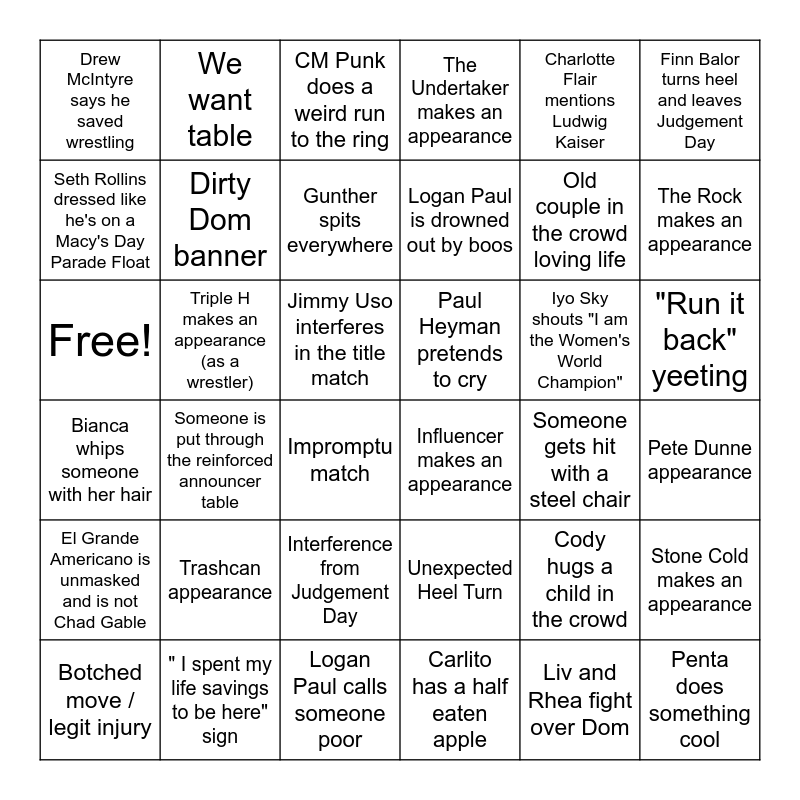 This bingo card has 36 words: Unexpected Heel Turn, Interference from Judgement Day, Carlito has a half eaten apple, Seth Rollins dressed like he's on a Macy's Day Parade Float, Bianca whips someone with her hair, Paul Heyman pretends to cry, Dirty Dom banner, Logan Paul calls someone poor, Charlotte Flair mentions Ludwig Kaiser, Cody hugs a child in the crowd, The Rock makes an appearance, The Undertaker makes an appearance, Stone Cold makes an appearance, Triple H makes an appearance (as a wrestler), Logan Paul is drowned out by boos, Drew McIntyre says he saved wrestling, El Grande Americano is unmasked and is not Chad Gable, Iyo Sky shouts "I am the Women's World Champion", Free!, CM Punk does a weird run to the ring, Jimmy Uso interferes in the title match, Someone is put through the reinforced announcer table, Influencer makes an appearance, Impromptu match, Someone gets hit with a steel chair, We want table, Old couple in the crowd loving life, " I spent my life savings to be here" sign, Gunther spits everywhere, Finn Balor turns heel and leaves Judgement Day, Penta does something cool, Botched move / legit injury, Pete Dunne appearance, "Run it back" yeeting, Trashcan appearance and Liv and Rhea fight over Dom.