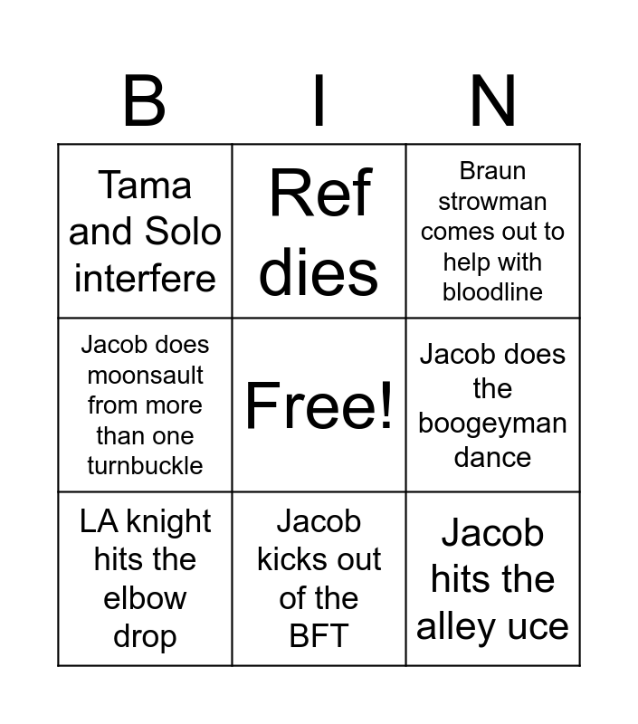 This bingo card has a free space and 8 words: Jacob does the boogeyman dance, Braun strowman comes out to help with bloodline, Ref dies, LA knight hits the elbow drop, Tama and Solo interfere, Jacob hits the alley uce, Jacob does moonsault from more than one turnbuckle and Jacob kicks out of the BFT.