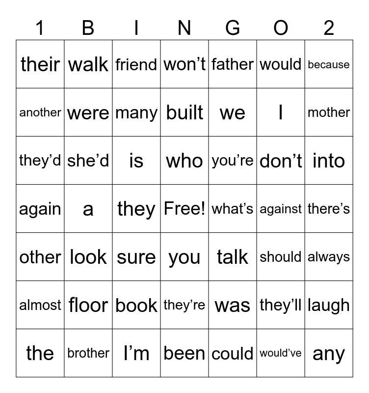 This bingo card has a free space and 51 words: the, I, and, a, is, talk, walk, could, would, should, because, won’t, don’t, you’re, they’re, other, another, mother, brother, father, we, they, their, were, I’m, any, many, been, into, friend, from, look, book, was, you, again, against, always, almost, floor, they’d, she’d, they’ll, would’ve, what’s, there’s, built, sure, laugh, who and whom.
