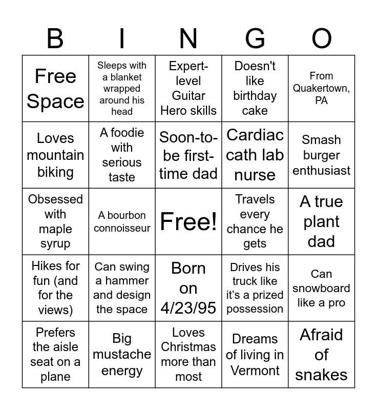 This bingo card has a free space and 26 words: Born on 4/23/95, Dreams of living in Vermont, Soon-to-be first-time dad, Big mustache energy, From Quakertown, PA, Free Space, Loves mountain biking, Sleeps with a blanket wrapped around his head, A true plant dad, Drives his truck like it’s a prized possession, Cardiac cath lab nurse, Obsessed with maple syrup, Can snowboard like a pro, Prefers the aisle seat on a plane, A bourbon connoisseur, Is a boat captain in a past life, Doesn't like birthday cake, Hikes for fun (and for the views), Expert-level Guitar Hero skills, Afraid of snakes, Smash burger enthusiast, Loves Christmas more than most, Travels every chance he gets, Can swing a hammer and design the space, A foodie with serious taste and Will 100% order an IPA at the bar.